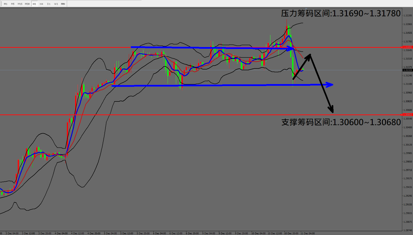 今日英镑/美元(12月11日) 早盘在1.31221附近,从技术分析面切入,1小时线级别观察走势符合昨日(10日)预测大幅下跌,目前K棒出现连3黑排列属于空方格局,因此有机会先做小幅反弹后再度下跌。