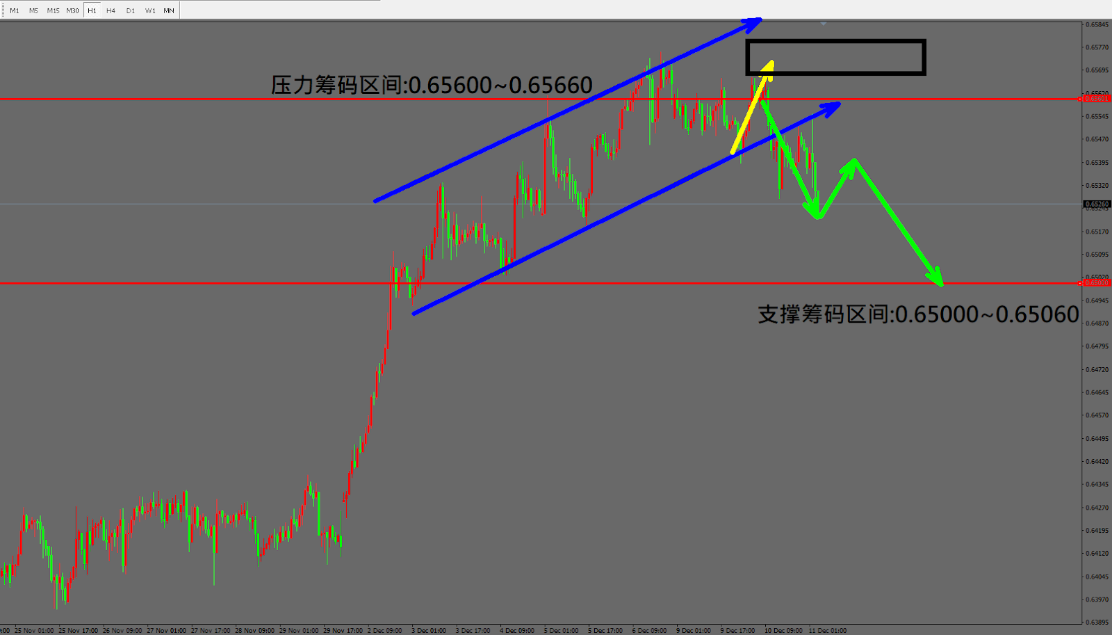 今日纽币/美元(12月11日) 早盘在0.65377附近,从技术分析面切入,1小时线级别观察走势符合昨日(10日)预测出现拉回修正,目前K棒连3黑是相当空方排列,同时跌破上升通道,因此有机会持续下跌。