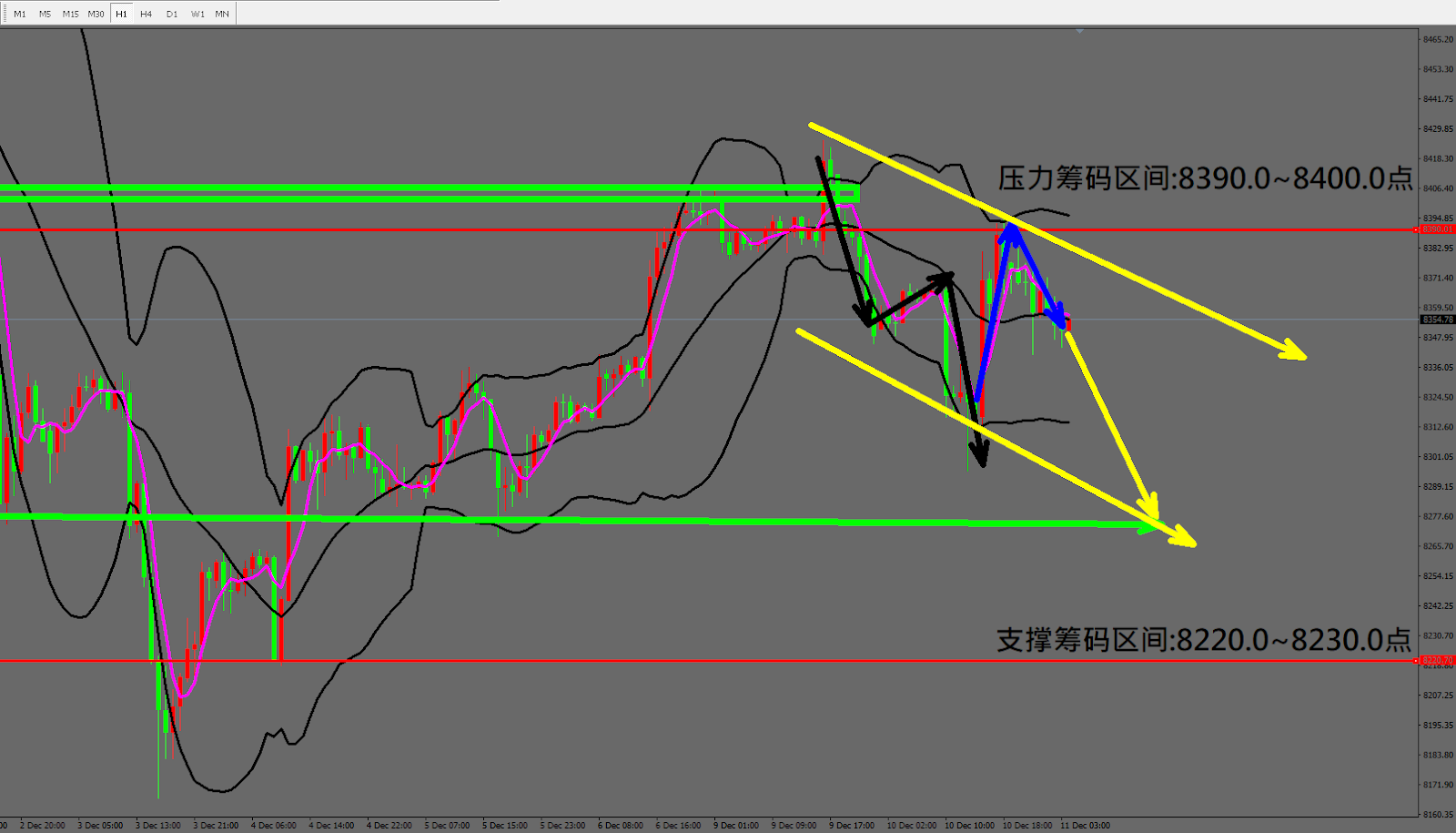 今日纳指(12月11日) 早盘在8364.2附近,从技术分析面切入,1小时线级别观察走势符合昨日(10日)预测碰至中轨后下跌,目前跌深反弹后K棒出现缓跌排列,因此有机会跌破昨日(10日)低点。