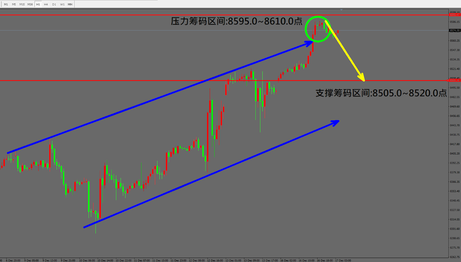 目前短线上方压力区间位于8595.0~8610.0点,下行方向,初步支撑区间于8505.0~8520.0点,操作心态偏短空为主,想进场做短空的投资者可考虑在8570.0至8585.0区间轻仓买进,止损点位可考虑设置8600.1上方。