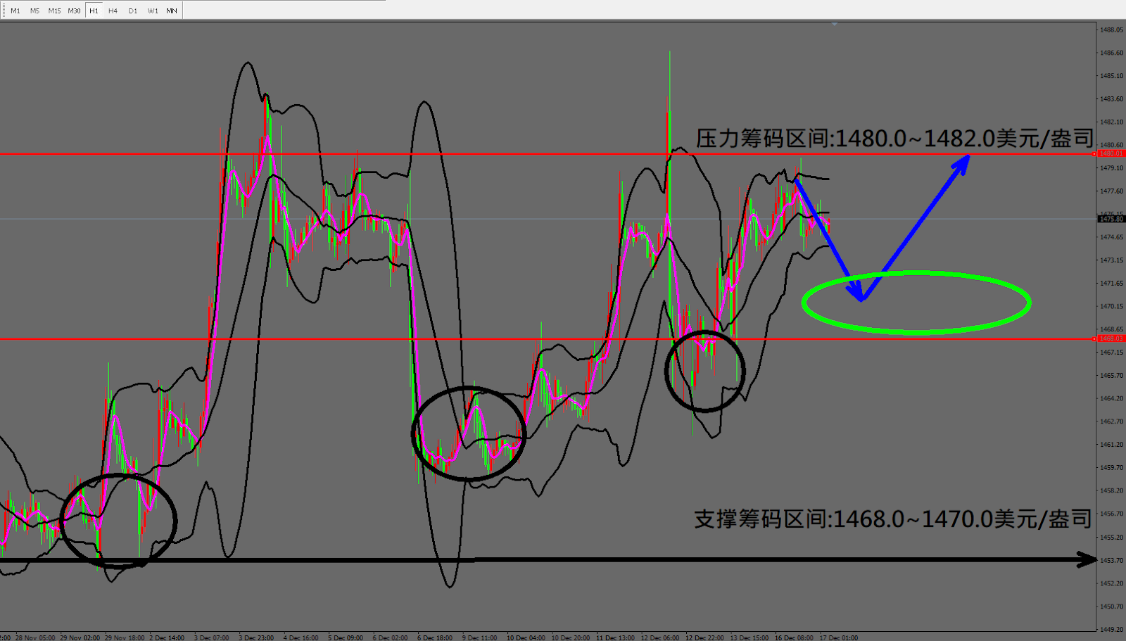 今日黄金(12月17日) 早盘在1475.8美元/盎司附近,从技术分析面切入1小时级别观察走势符合昨日(16日)预测站稳后冲高上涨,目前遇压做拉回修正,因此有机会从高点拉回至图中绿色支撑区间。