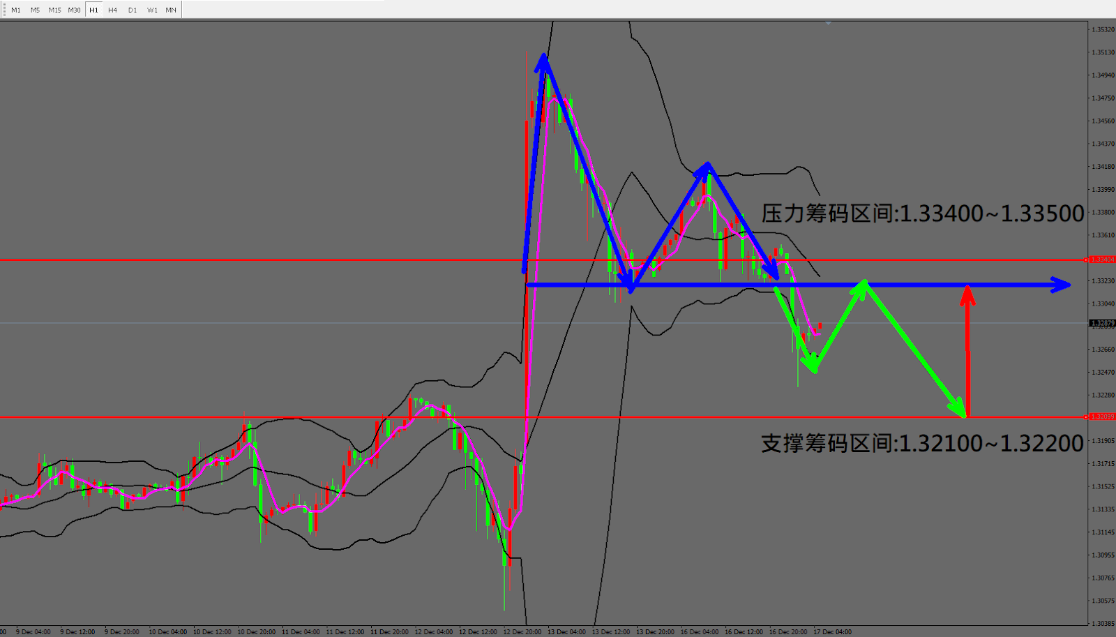 今日英镑/美元(12月17日) 早盘在1.32850附近,从技术分析面切入,1小时线级别观察走势符合昨日(16日)预测出现反弹行情,目前K棒跌破小型颈线,位于布林通道中轨与下轨之间,因此有机会反弹后持续下跌。
