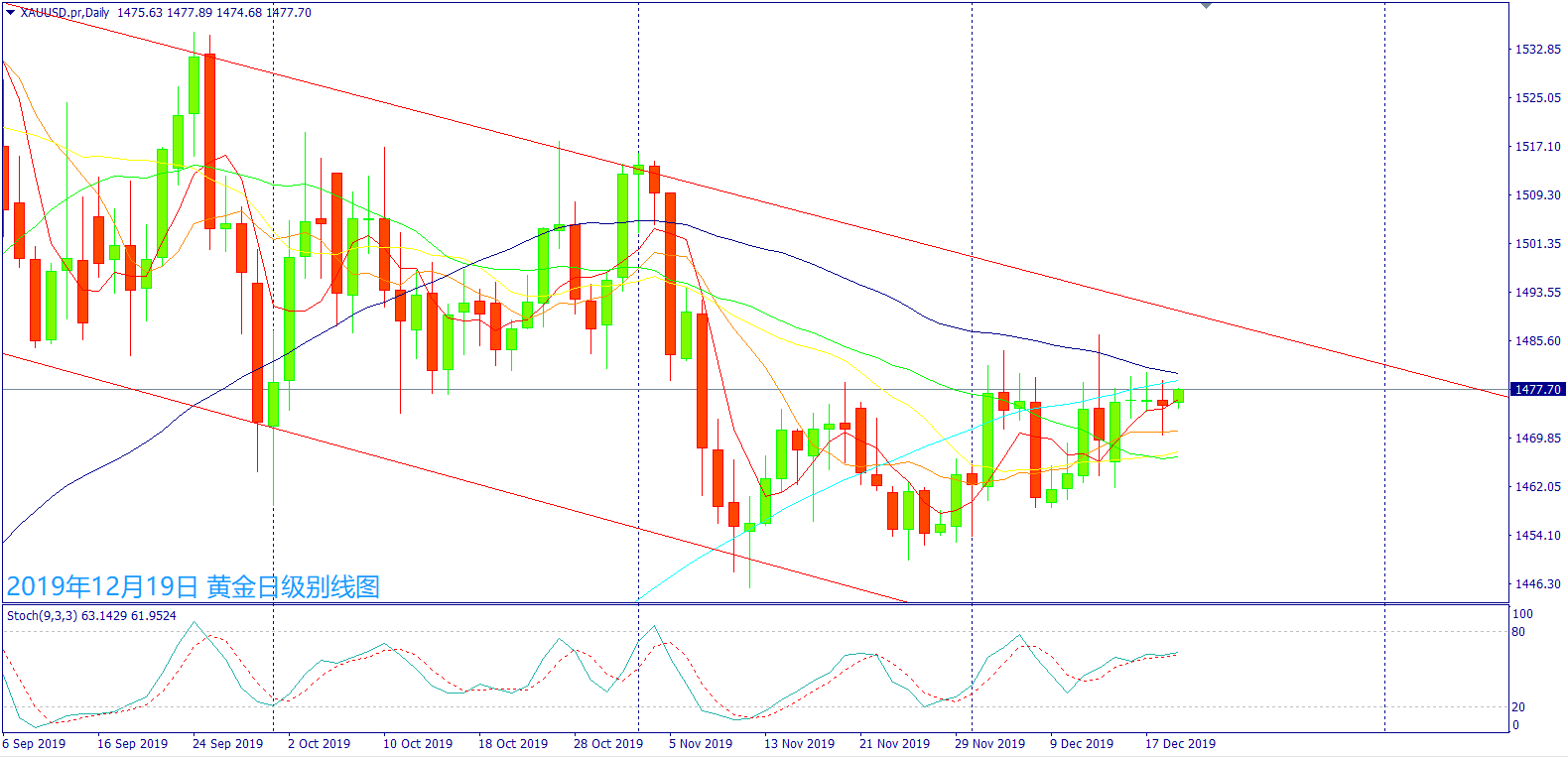 从日级别线图来看,一纺锤线短阴烛盘中冲高120日均线受阻,一度受到美元强涨下回踩10日均线,近3日于1475美元附近出现3根十字线,今日守住5日均线仍将有机会突破1480挑战12月12日高点。今日早盘市场对美国众议院弹劾特朗普投票担忧,一度出现避险买盘带动上涨,留意前日起跌高点可能出现卖盘造成回踩5日均线,如果晚间英国利率决议公布持平造成美元回调,黄金将大机会出现买盘带动上行突破1480关口,以及晚间震荡整理过后,美元仍然冲不过97关口并且涌出抛售卖盘急跌,黄金可能在投机买盘带动下挑战前高1486.7美元。