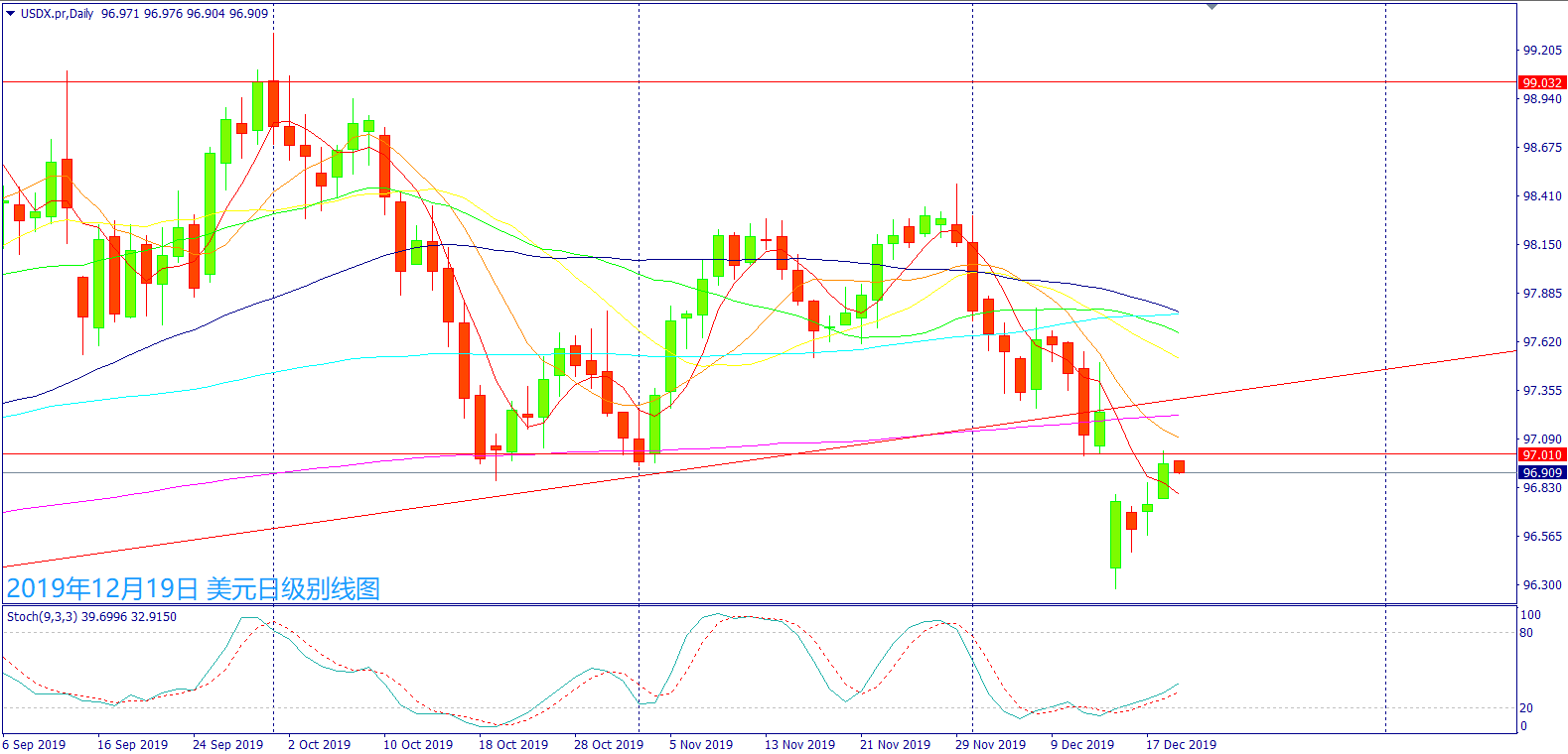 美元昨日仍受到市场担忧限期脱欧利淡,早盘镑美下跌62个点推升美元走扬,随后处于横向整理走势,午后受到德国PPI不及预期,一度带动美元突破当日最高价格,随后欧洲央行行长拉加德称对目前货币计划感到满意,一度带动欧元急涨也让美元出现急跌;晚间欧洲央行官员称仍需要宽松货币,以及美联储官员多位称美国经济状况良好,再度带动美元急涨突破当日最高价格,随后于97关口前处于震荡整理走势,终场上涨做收。