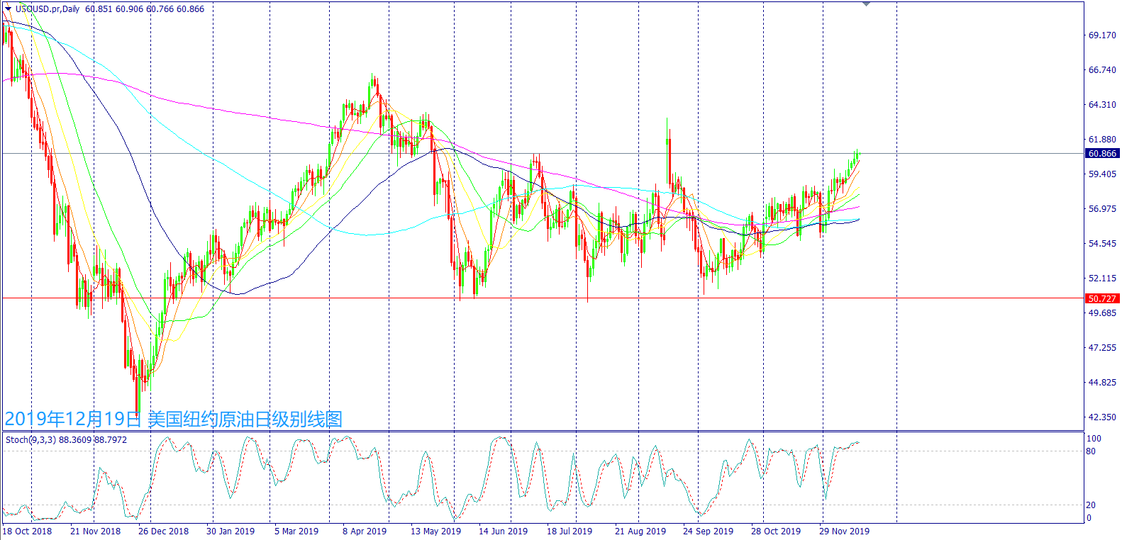 从日级别线图来看,一纺锤线阳烛盘中震荡后再度突破新高,连续拉出5根纺锤线沿5日均线上涨,移动均线再度出现多方排列,但KD指标多方钝化近两周,短线透过养空和扎空走势创高,留意5日均线失守将扩大下跌走势。今日留意欧美经济数据造成震荡走势,晚间英国利率决议如市场预期持平,一但造成股市出现回调可能带动油价走跌,而午夜前后美国众议院将对美墨加贸易协议审理,油价可能出现预期买盘带动急涨,留意投票结果公布后,油价出现获利卖盘造成下跌。