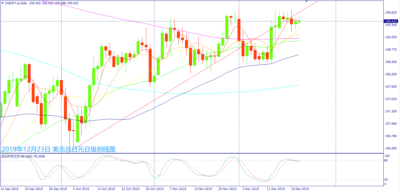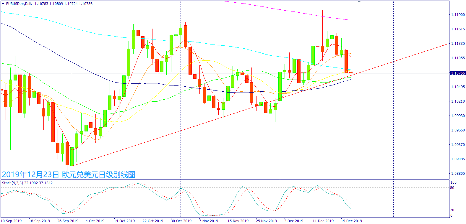 欧元兑美元上周五早盘于10日均线附近整理,午后经济数据好坏参半,仅造成欧美震荡整理;晚间欧元出现耶诞节前夕的卖盘造成急跌,随后美元阻力区出现回调,带动欧美出现小幅度反弹,直到美国经济数据利好再度带动美元续涨,造成欧美再度跌破1.1100关口,随后市场乐观英国下议院通过脱欧法案,也让欧美于1.1100关口下横向整理,直到英国通过脱欧法案,欧美并没有买盘带动冲高,随后出现抛售卖盘造成欧美回落到30日均线,午夜过后出现回补买盘带动站回120日均线,终场仍下跌做收。
