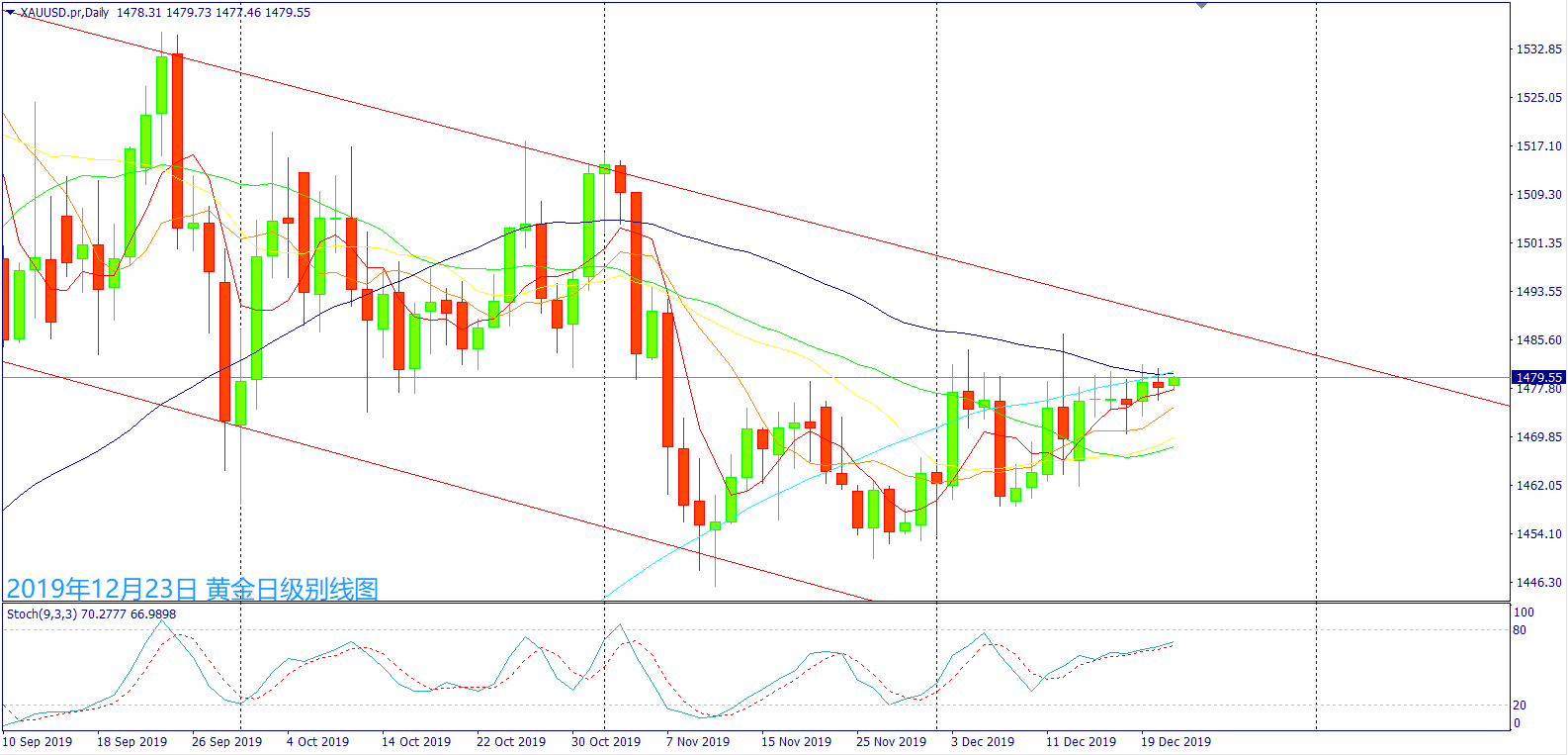 从日级别线图来看,一纺锤线短阴烛介于前一日高低点间震荡,短中均线出现上行走势,近期沿着5日均线震荡走扬,今天可能受到耶诞假期前日卖压消化完毕后,投机买盘带动急涨站上1480关口。早盘受到英国通过限期脱欧法案,一度出现避险买盘带动上涨,留意午后欧美股市震荡造成黄金再度回踩5日均线,如果晚间美国经济数据公布,美元可能出现获利卖盘造成下跌,将大机会带动黄金冲破1480关口之上。