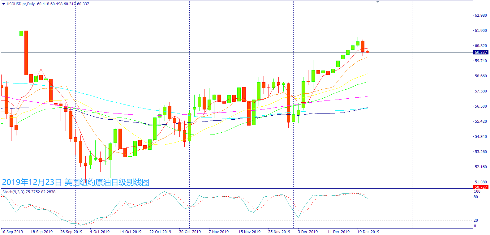原油上周五早盘于61美元上方整理,午后传出日本首相将与伊朗总统会谈,市场解读将化解地缘政治纠纷,一度造成油价出现卖压震荡走跌;晚间受到美股反弹下,一度受到投机买盘带动突破当日最高价格,随后节前获利卖盘造成油价从高点急跌1.2美元,午夜过后一度出现反弹,但是受到美国原油钻井大增18口下再度走跌,随后于5日均线下方震荡整理,终场下跌做收。