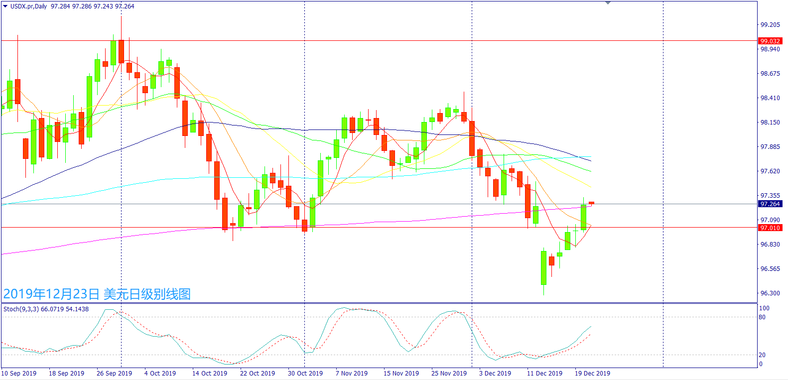 从日级别线图来看,一上影线长阳烛盘中回踩5日均线,受到欧元抛售卖盘和美国贸易协定利好,带动美元突破240日均线,5日均线上行或中均线下行,短线触及12月11日起跌阻力,可能回落到97关口附近震荡整理。今日开始欧美耶诞假期前夕,交投慢慢转为清淡,留意午后市场调节筹码造成震荡整理走势,晚间美国经济数据公布可能造成美元回调整理,如果美国没有再度传出贸易协议或经济数据利好,可能处于横向整理走势。