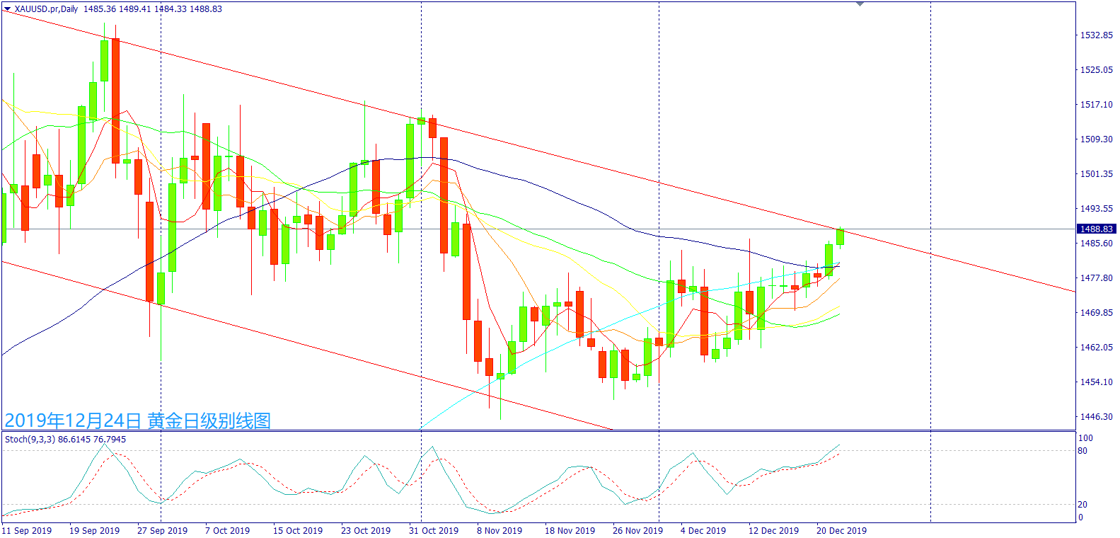 从日级别线图来看,一长阳烛早盘回踩5日均线,受到耶诞假期交投清淡,黄金意外出现扎空盘冲上60日均线,短中均线出现上行走势,短线留意上涨触及下降矩形阻力价位,可能从高点回落到60日均线附近整理。今日早晨持续传出朝鲜引发地缘政治问题,早盘带动黄金急涨冲高至1490关口前,留意为近期1475美元附近养空的扎空盘操作,欧盘交投清淡可能出现更剧烈震荡,留意晚间美国经济数据公布后,美元和美股出现回调走势,黄金反而出现获利卖盘造成下跌。