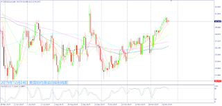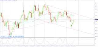 从日级别线图来看,一纺锤线阳烛受到美元投机买盘带动上涨,让欧美一度回踩30日均线,直到美国经济数据不佳,欧美买盘带动站回120日均线,短线受圆形顶盖头反压,但近2日于上升趋势线获得支撑买盘,受到耶诞假期短线可能于120日均线附近震荡整理。今日欧洲开始进入耶诞假期,因此早盘和下午可能处于交投清淡横向整理,直到晚间美国经济数据公布后,有机会出现震荡整理,只要没有其他美国官员讲话影响,欧美仍将于120日均线附近整理。