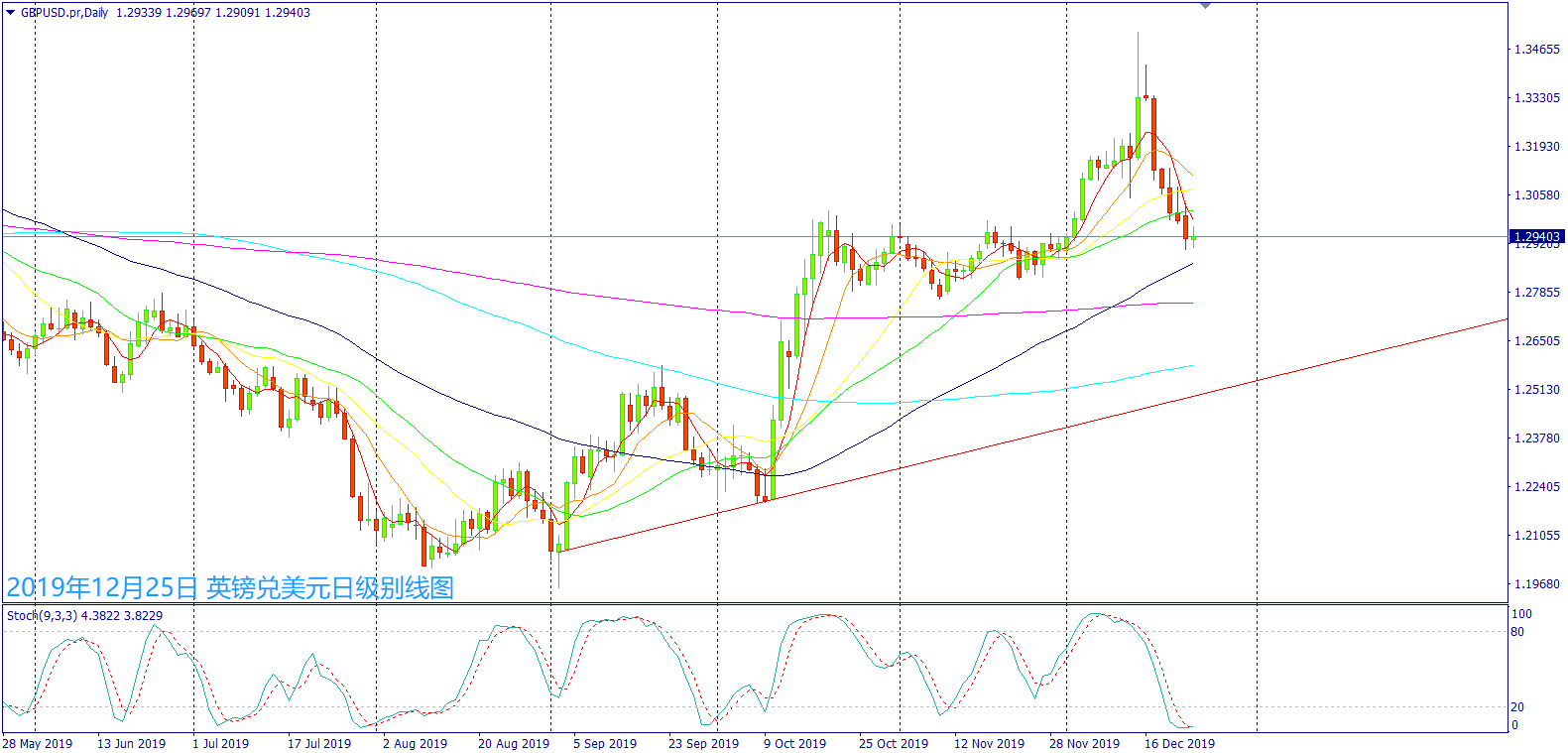 从日级别线图来看,一十字线介于前日高低点间震荡,受到耶诞假期影响转为狭幅震荡,从倒V反转后出现连续6根阴烛大跌500个点,短均线下弯或中均线持平,处于多方修正可能回踩60日均线1.2866,近期KD指标出现空方背离,短线消化卖压完毕可能出现反弹走势。今日为耶诞节假期,MT4系统没有报价。