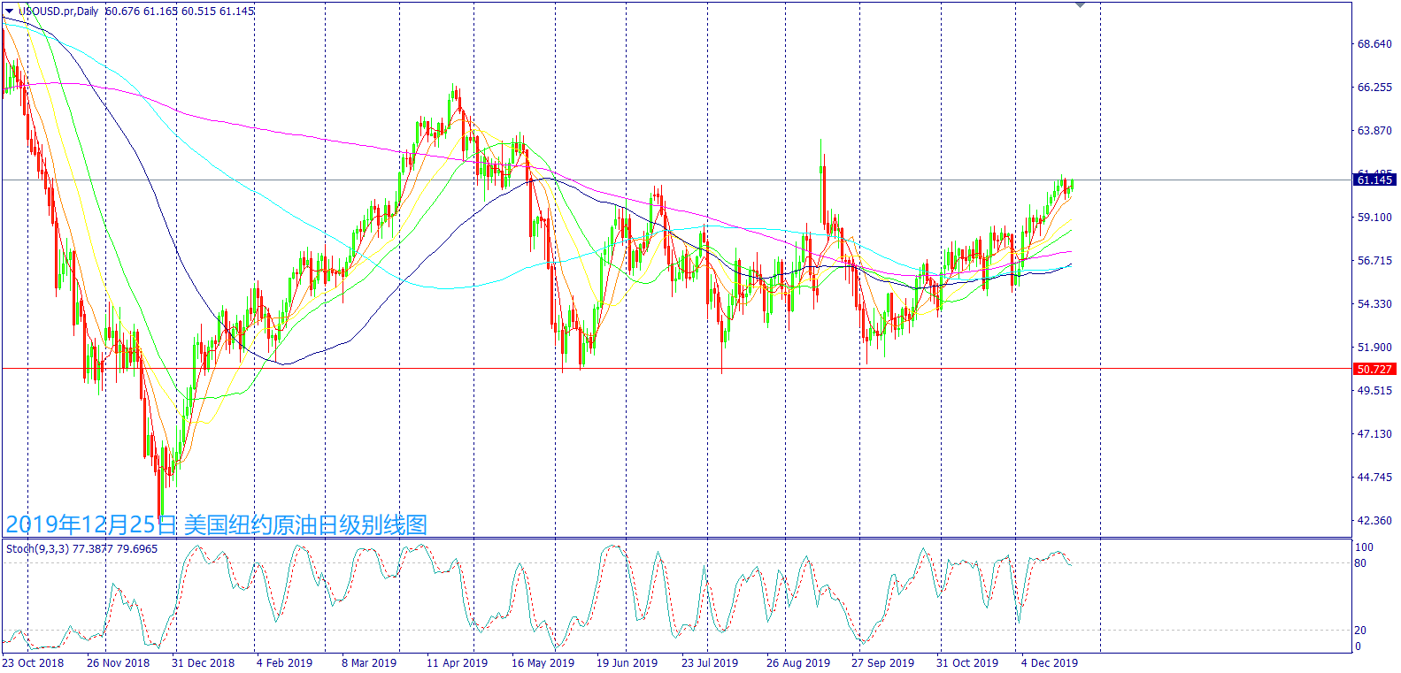从日级别线图来看,一短下影线阳烛早盘于5日均线附近震荡整理,受到假期前空仓调节带动站上61美元,移动均线维持多方排列,近4日于61美元附近震荡整理,短线没有跌破5日均线将大可能再度突破新高价格,近期留意节日交投清淡,可能受到KD指标多方过热出现回调走势。今日为耶诞节假期美国交易所休市,MT4系统没有报价。