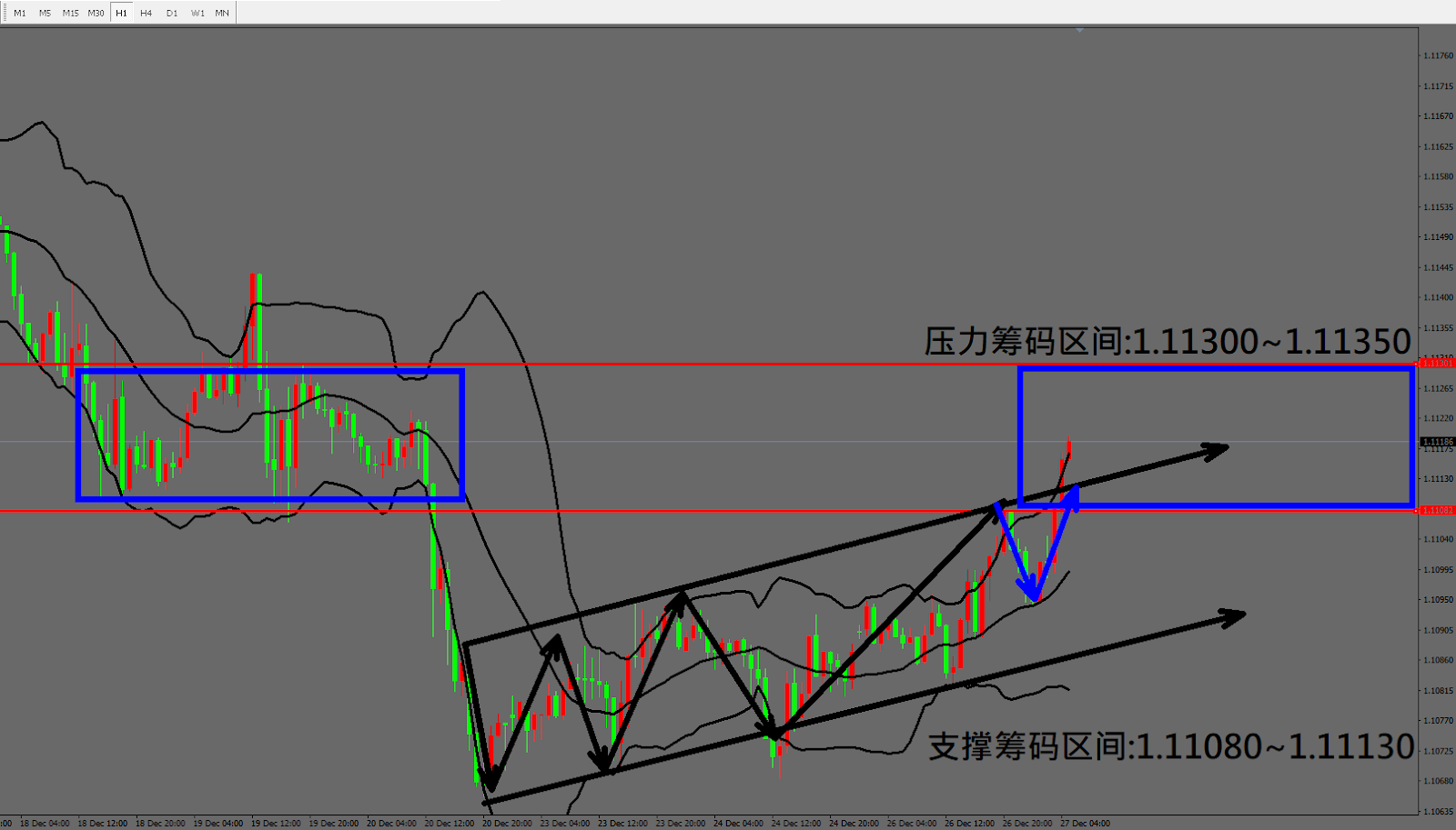 今日欧元/美元(12月27日) 早盘在1.10948附近,从技术分析面切入,1小时级别观察走势符合昨日(26日)预测架构持续上涨,目前K棒已经突破上升通道强劲上涨,因此有机会冲高至图中蓝色区间后震荡。