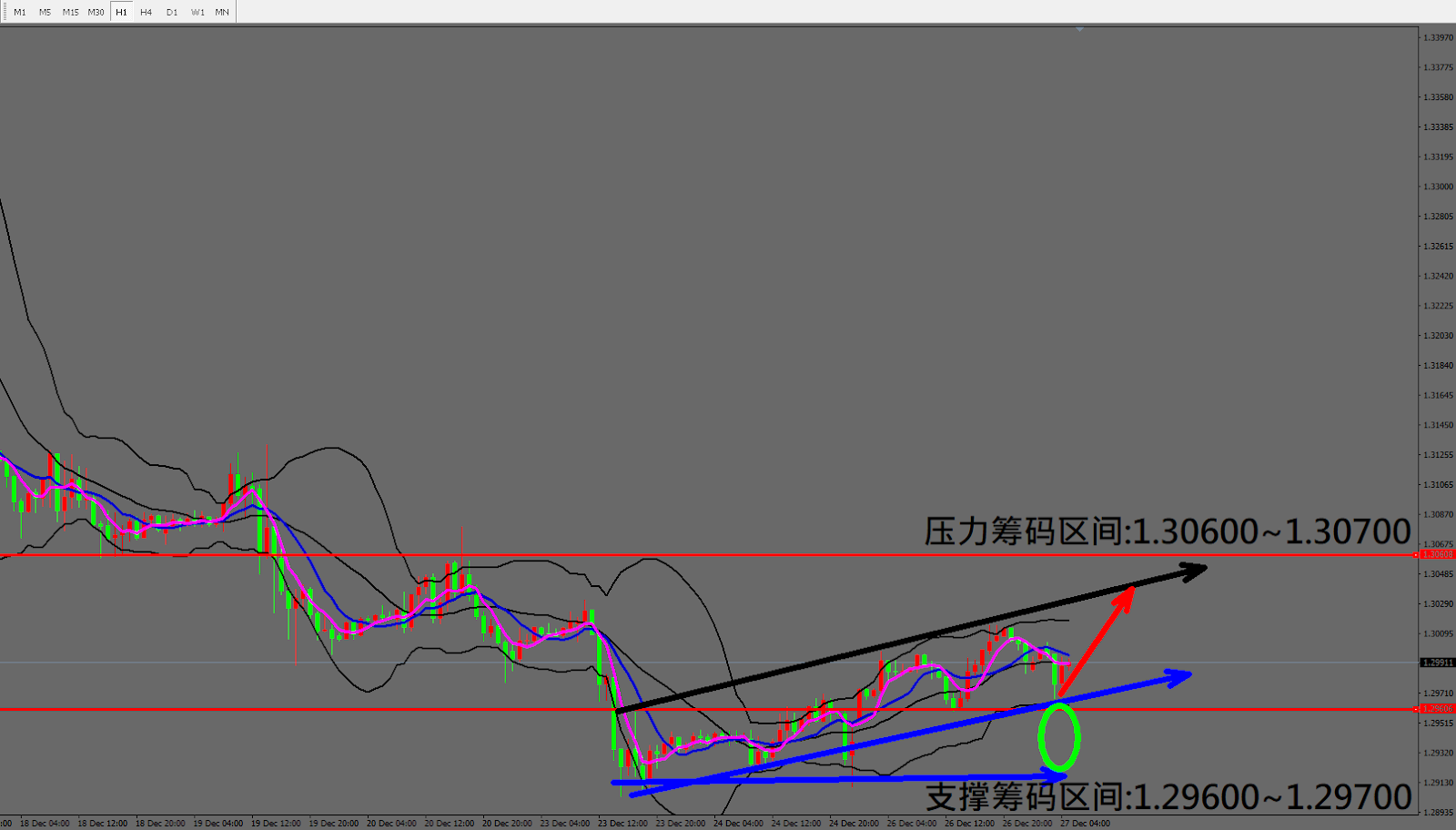 今日英镑/美元(12月27日) 早盘在1.29932附近,从技术分析面切入,1小时线级别观察走势符合昨日(26日)预测架构上涨,目前K棒再度拉回至中轨(20MA)附近,因此有机会持续上涨行情。
