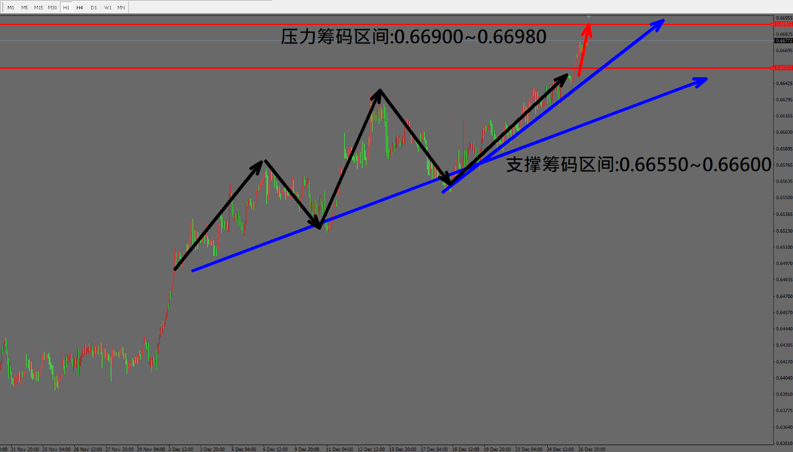 今日纽币/美元(12月27日) 早盘在0.66652附近,从技术分析面切入,1小时线级别观察走势符合昨日(26日)预测架构持续上涨,目前K棒维持多方排列,因此有机会持续上涨。