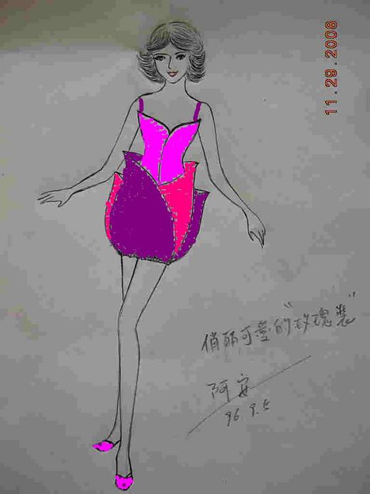 玫瑰花很美,如果能穿在身上更增豔麗。我隨手設計這件服裝,希望給心情沉悶的人一些喜悅。