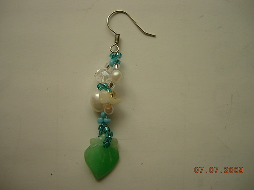為了串出我想要的耳環,我另外採購了一些天然珍珠及人造水晶。至於玉墜要去哪裡找呢?我忍痛將皮包吊飾拆掉,把玉墜拿來串成我想要的樣子。起初,樣子還是太單調,我去買了串珠的書籍來參考,本來看不懂還後悔不該買書;但是想到以前上班做打樣師時,還不是不會也得會〈那時絞盡腦汁也得交出成品〉。於是不停的研究摸索,看著圖形穿穿看,先從簡單的開始學,竟然讓我漸漸做出成品,看看這付耳環,這是獨家設計的外界找不到喔!