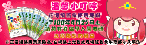 總部呼籲:花博預售票使用期限至100年4月25日(一) 止,請民眾把握最後機會入園參觀 <2011/04/15>