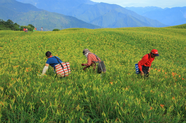 ↓遠遠的可以看到,一條小徑鋪滿採下來的金針花,好似黃花星光大道一般。