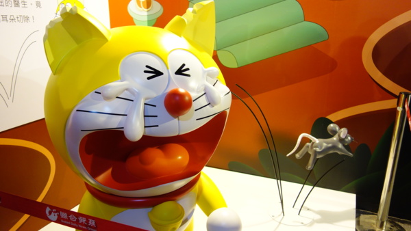 此次展覽大致可以分成三個區塊,一進門就看見原始的哆啦A夢,從量產的黃色保母機器人到因為世修(大雄的曾孫)下錯指令,讓機器老鼠咬掉了耳朵,因為哭泣、掉漆變成藍色哆啦A夢的過程。大型的展覽看板配合模型展出,還有一段卡通影片,小小一塊展區立刻讓人憶起哆啦A夢的故事,更期待接下來的展覽內容。