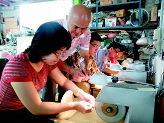 花蓮縣壽豐鄉如豐琢玉工坊負責人姜錦源(左二)指導遊客 DIY 台灣玉技巧。(記者范振和/攝影)