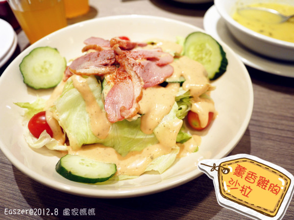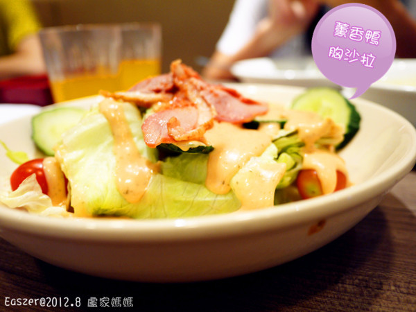 在我們還沒仔細品嚐小菜跟湯的時候,薰香雞胸沙拉就上來了