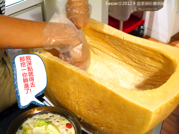服務員推著一個超級大的起司過來 現場用工具來刮起司