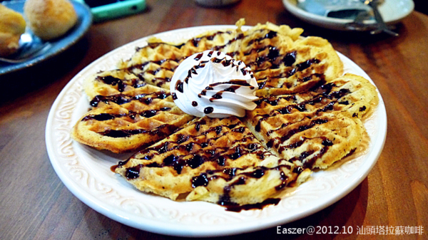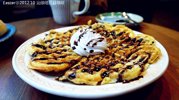 只在鬆餅上簡單淋上巧克力醬,並且擠上一球鮮奶油