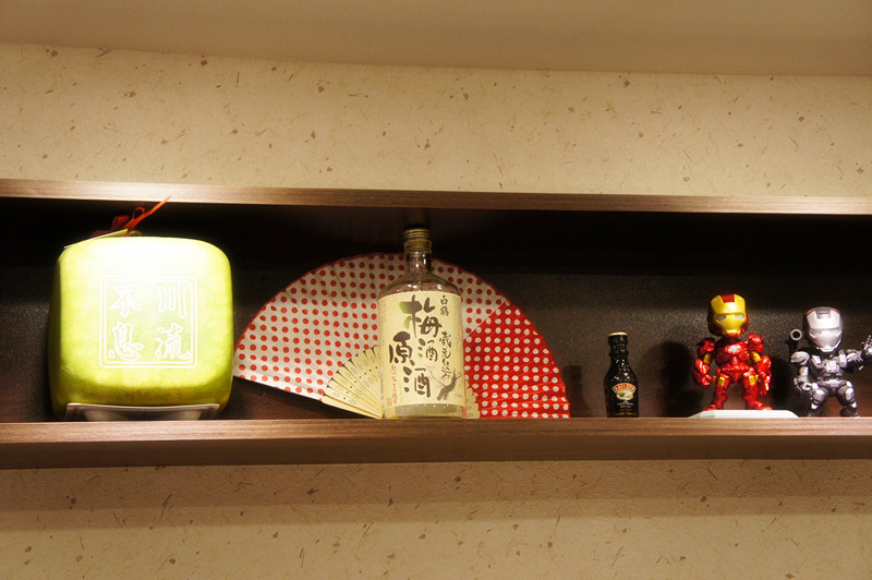 櫃檯上方的方形西瓜、梅酒瓶子與貝禮詩奶酒迷你瓶,