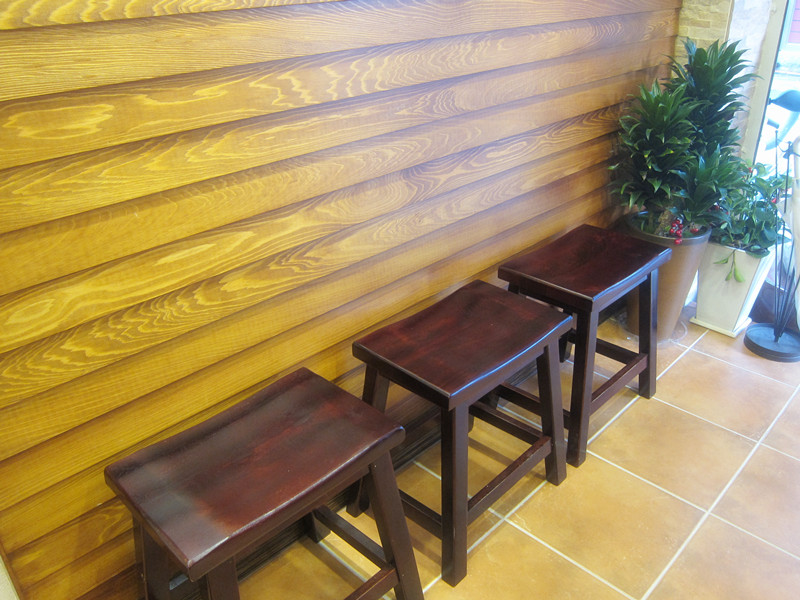 店內有兩排木製座椅加上吧檯的高腳椅,