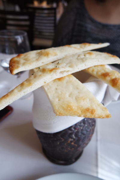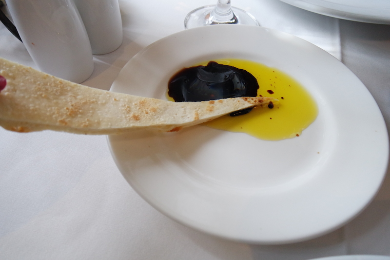 La Giara的水是要用單點的,我們今天喝的是義大利進口的Acqua Panna,餐前每桌都會送上用烤薄餅,這有點類似比薩的餅皮,吃起來很有嚼勁,配著橄欖油與油醋一起吃真是絕配!