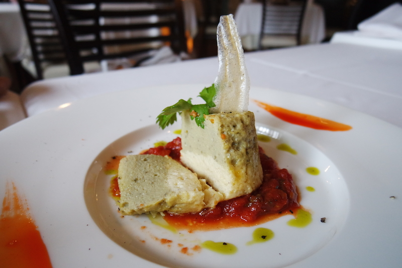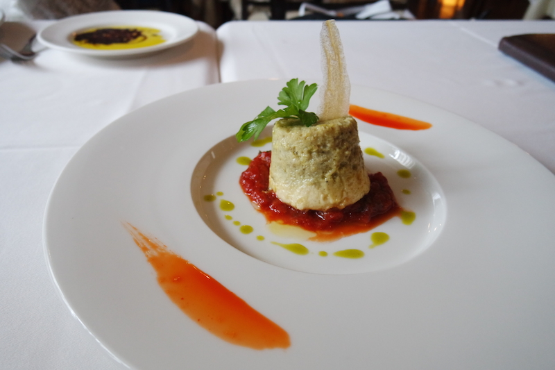 今天我們點的開胃菜是淡蕃茄醬起司紫茄舒芙蕾,特別的是這是一道熱的開胃菜喔,上面是茄子泥下面佐起司搭配上特製番茄醬汁,吃起來有濃濃的起司香,配上番茄醬汁好吃又不膩,番茄醬汁是用新鮮番茄下去熬煮的,番茄的甜味與酸味搭配上起司舒芙蕾真的是恰到好處。