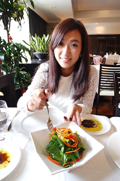 沙拉部份我們選擇一般外面比較少見的菠菜沙拉,選用台灣產的新鮮菠菜,搭配新鮮蕃茄及胡蘿蔔絲。薑加上大蒜調配的獨門醬汁拌在一起,色香味俱全讓人食慾大開。本來以為薑配上大蒜的醬汁組合吃起來會有點嗆辣,但口味卻很溫和,還有橄欖油的氣味。再加上店家選用比較嫩的菠菜葉,吃起來沒有很生的菜味,實在是太推薦了。另外,服務生還跟我們分享了義大利人吃飯的習慣,就是很喜歡在每道菜上加上黑胡椒(除了甜點外),這樣可以更增加菜餚的風味。