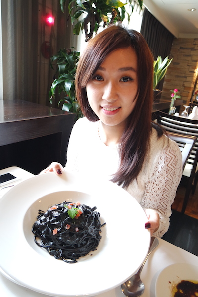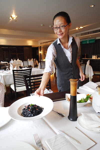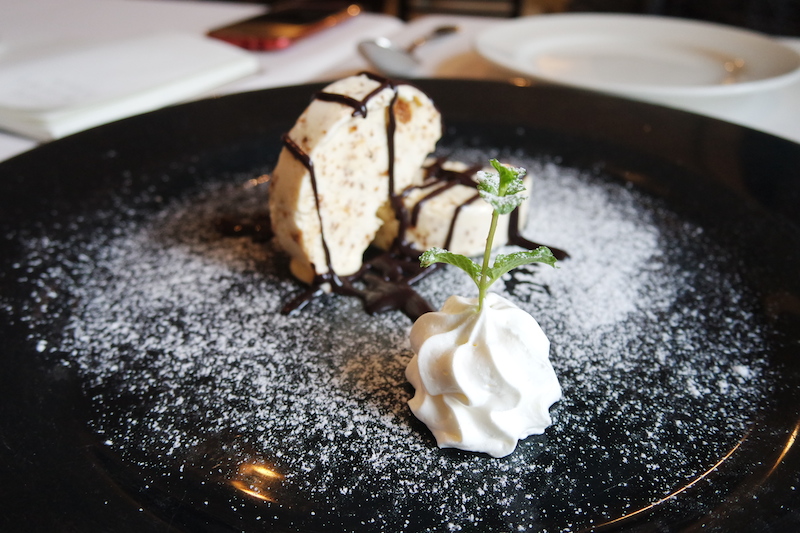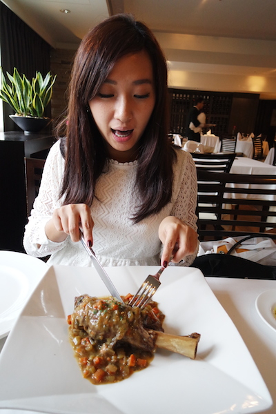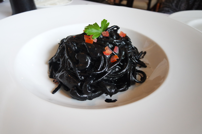 主菜我們分別選了一道墨汁長條面以及畢蘭德羅小羊膝。墨汁長條麵主廚是用新鮮墨魚汁以及些許番茄下去做source,麵條軟硬適中,吃起來不會有海鮮的腥味,反而是一種鮮甜,我第一次吃到真正墨魚囊的味道,不過吃完這道菜嘴巴跟牙齒馬上黑漆漆一片,所以如果是剛交往的情侶來約會,可能要避開這道或是選擇晚餐時段來用餐(晚餐時段只有燭光,比較昏暗)。