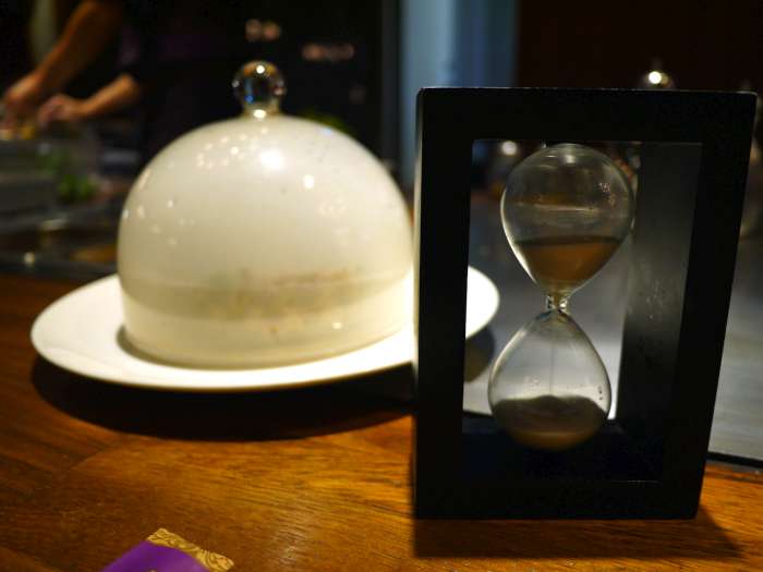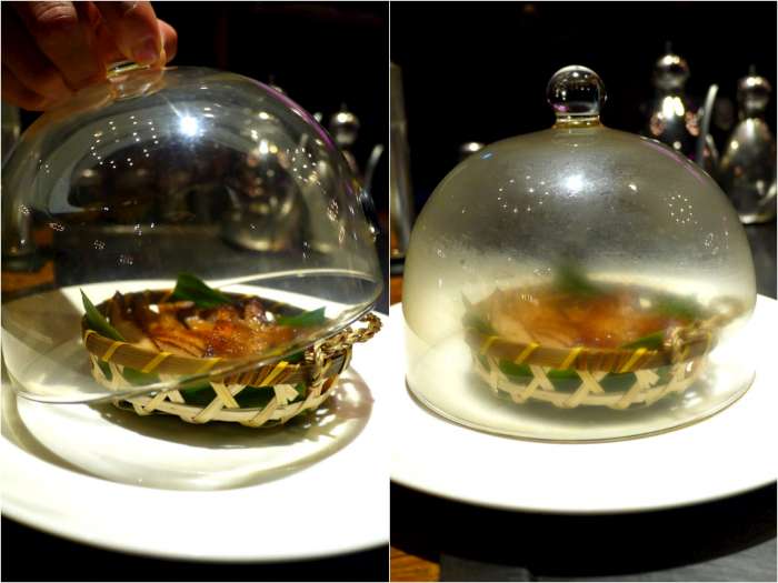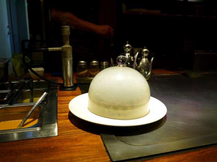 ▲取一個玻璃罩子將醃浸且以鐵板煎過的松阪豬罩住,然後進行分子料理煙燻調理~