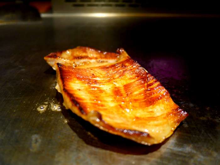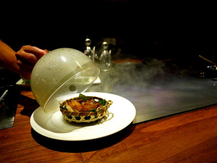 天哪真是太開心了~每道主菜上菜後服務人員或鐵板師傅都會精心介紹兩~三種吃法,像這道煙燻松阪豬,由於歷經淹浸、香煎、煙燻三到程序,本身就已經非常有味道了,因此第一種吃法是直接品嘗!不愧是名號響噹噹的松阪豬口感Q彈不柴不硬,香茅的香氣經過浸漬煙燻讓每一滴肉汁都充斥著滿滿的香料氣息,鼻腔舌尖也全是草香燻燒的獨特氣味~