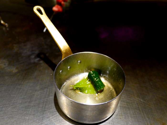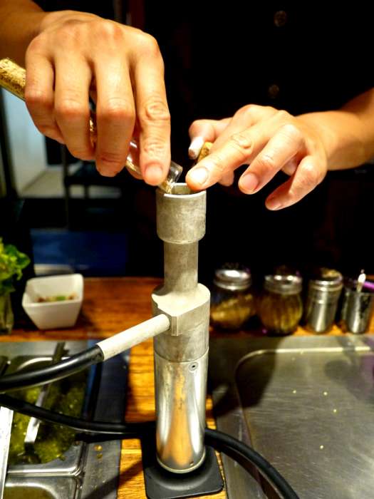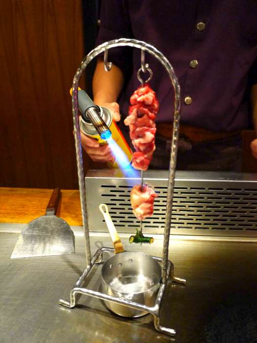 是的,正是噴槍,一切真是太酷了,原來香油的製作是以噴槍炙燒整串牛肉,尤其是脂肪塊的地方是主要的「油源」,火熱滾燙的牛油順勢包覆香草束滴滴精華流入最下方盛接香油的小小器皿,精緻&精彩的製油過程小編全程目不轉睛呀O口O