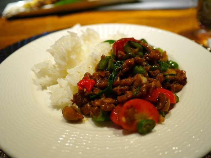 ▲由親切帥氣服務生小姐及時端上傳說中無限供應的泰式打拋雞(特製醬料+嚴選雞腿肉唷!)