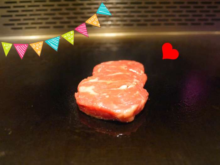香油烹調完畢主角華麗麗的奔跑進入(!!?)鐵板行列,除去剛剛那些邊邊角角的肉,廚師大哥解釋,中間這塊「肉心」便是一塊非常乾淨漂亮的沙朗牛排~