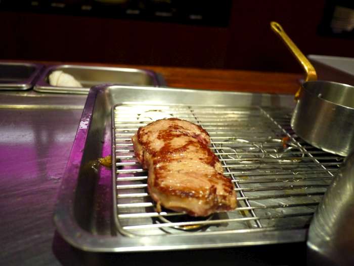 沙朗牛料理好之後得放在旁邊稍置片刻,廚師大哥解釋,五分熟的肉排外表炙熱香熟,但由於溫度傳遞速度的關係內部溫度還不是很高,因此得讓它稍待片刻才能盛盤。