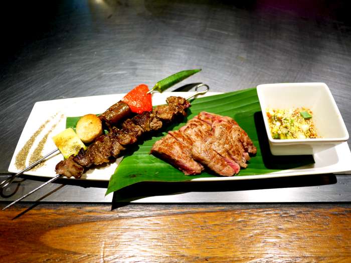 香油炙沙朗牛一樣附上特製泰式醬料及香料胡椒鹽,至於怎麼吃這道香油炙沙朗牛呢?小編淺淺心得順序是沙朗牛(肉心)→肉串(邊肉)→蔬菜串。