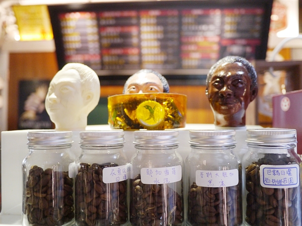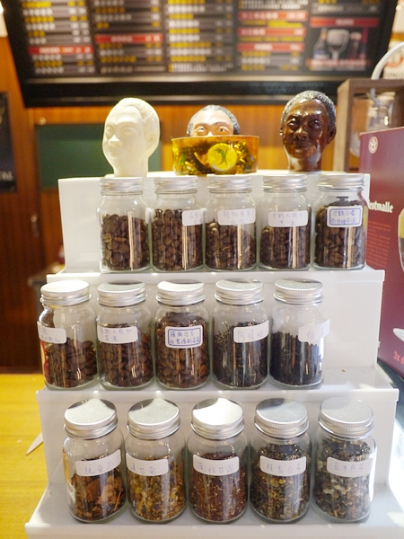 櫃台前有單品咖啡的試聞罐 最底層是美國茶王的花茶 放在台前這些單品 聞過喜歡都可以點來喝