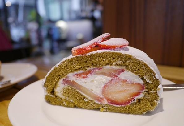 抹茶草莓蛋糕捲 這裡換成了抹茶海綿蛋糕體 蛋糕口感濕潤又柔軟 內捲鮮奶油和新鮮草莓切片