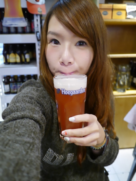 後來老闆說他們的比利時水果啤酒也很好喝 裝了一杯女生口味的啤酒讓我們試試 新鮮的比利時啤酒成本較高而且不易保存 一般店家提供的多是罐裝啤酒 北義是少數引進生啤的店家