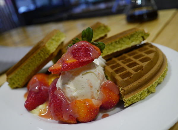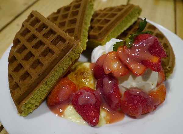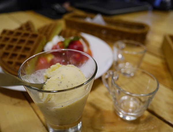 一般會搭配原味鬆餅 加價$30元就可以換成抹茶口味囉 是用宇治抹茶粉調的味道 另外店家選用Baxter Gelato的義式冰淇淋 這是以天然食材為訴求的手工冰淇淋 但是只用新鮮水果做當季口味 目前草莓口味還沒出 老闆就先用莫凡彼的香草冰淇淋代替