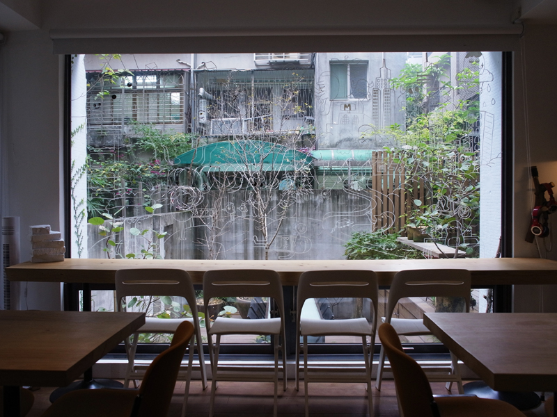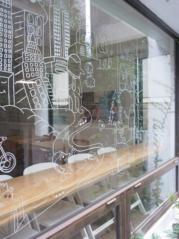 聽著孫大偉先生說賞鳥、種樹....,插畫家在窗上留下的插畫, 舒服的用餐環境