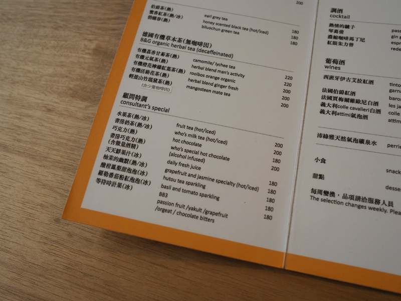 與三位專業餐飲顧問研發的飲料單開始,感受who's café的用心,研選的咖啡及有機茶飲(有記茶莊與德國B&G) ,顧問特調飲料都相當有特色,十分推薦來這裡一定要試試