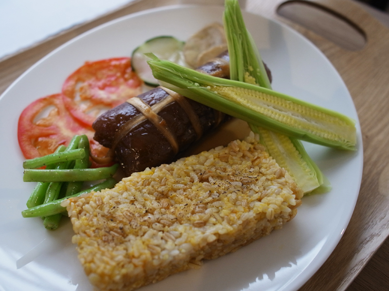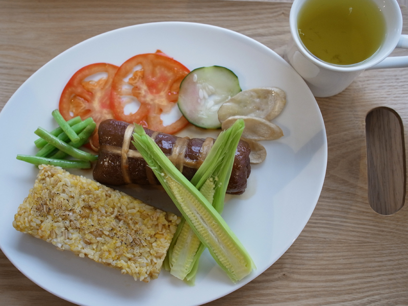 膠原捲腱子肉 nt340 (每日限量供應,套餐均佐天然五穀米餅或台北知名店家珠寶盒法式點心坊 (boite de bijou ) 麵包,再附上一杯隱藏版有機高山油菊花茶,續杯nt50) 。 傳說中大家最愛吃的『膠原捲滷腱子肉』,一片入口即化的QQ膠原豬皮包裹了軟嫩的豬腱肉,以『瓠瓜皮』(宜蘭媽媽真有品味!)綁著,用刀叉切一塊塊入口,好適合我這種喜歡吃肥肉但又討厭油膩的人,吃完由衷的感覺皮膚應該變好,我想等等母奶也會很好喝。