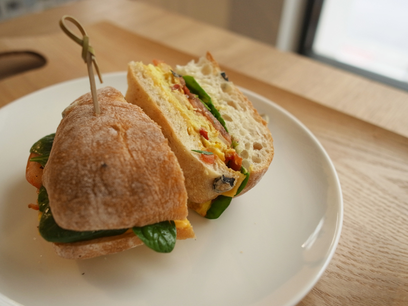 嫩小菠菜烘蛋三明治nt230 烤過的珠寶盒橄欖拖鞋麵包,內含非常嫩的進口菠小菜、番茄、起司與特製烘蛋, 菜單上寫的[多層次口感完美呈現]一點都不誇大